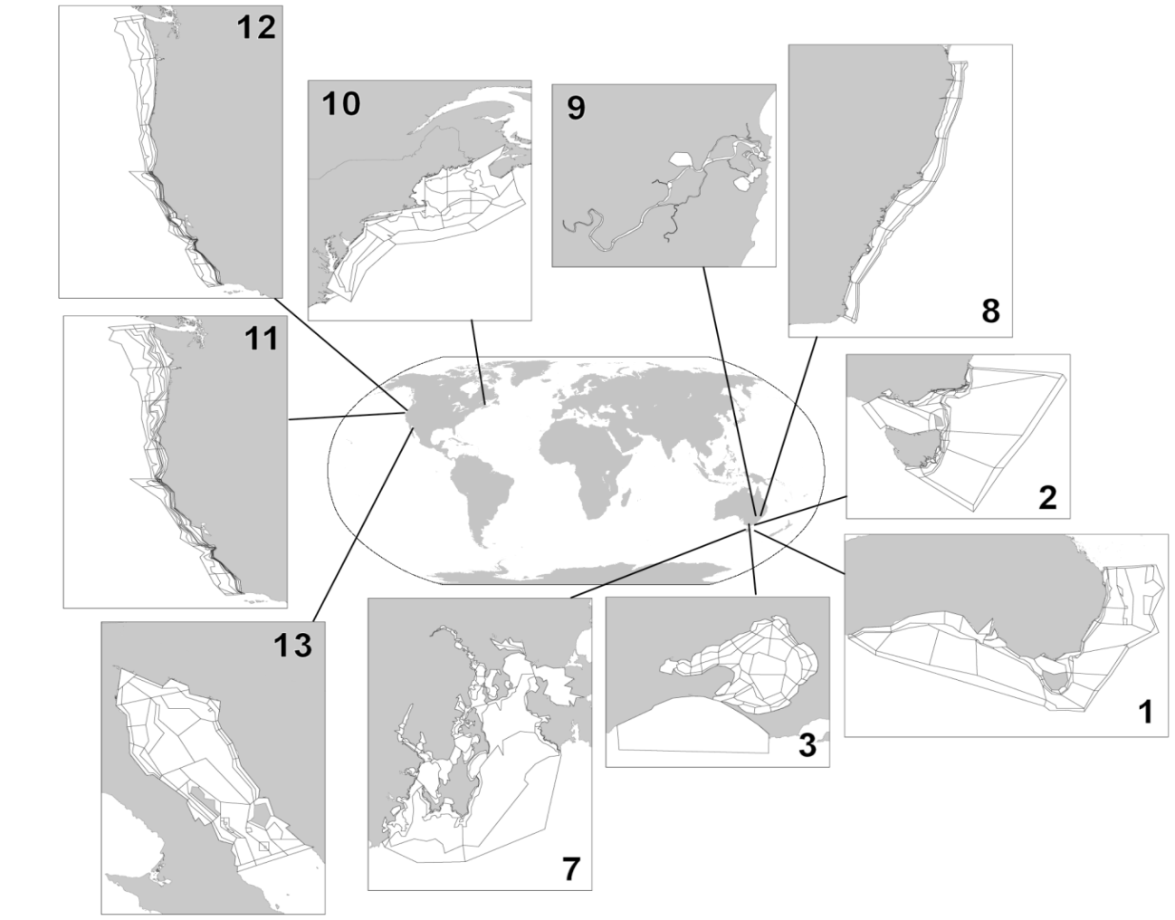 Most Atlantis development and applications have centred on evaluating alternative management strategies for multispecies fisheries, or exploratory analyses of multiple ecosystem pressures. To date, the Atlantis framework has been applied to over 30 ecosystems around the world (Fig. 1) primarily to study questions of:
