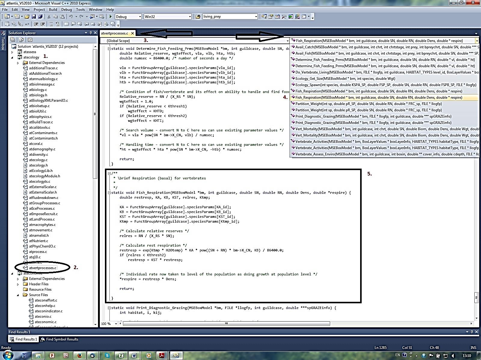 Once you open your solution file in Visual Studio C++, expand the submodel atecology (1.) and double click the atvertprocesses.c file (2.). The file will be opened (3.) and on the right side you have a drop-down menu to browse through the routines defined in the file (4.). By clicking on the Fish_Respiration()routine you will find the description of parameters and equations used to calculate it Note that the first reference to Fish_Respiration() in the drop-down menu has a small arrow next to it. By clicking on this option you will find where in the code the routine is called.