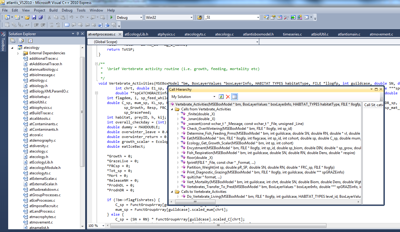 Another useful tool in exploring the code is the Call Hierarchy tool. It allows you to see the routines that call or are called from the routine of your interest. In Visual Studio this can be called by clicking the right mouse button while holding the pointer over the routine name and selecting “View Call Hierarchy” option. In the example below, we can see that routine Vertebrate_Activities() is called from Do_Vertebrate_Living() routine, and that many other routines are called from Vertebrate_Activities()