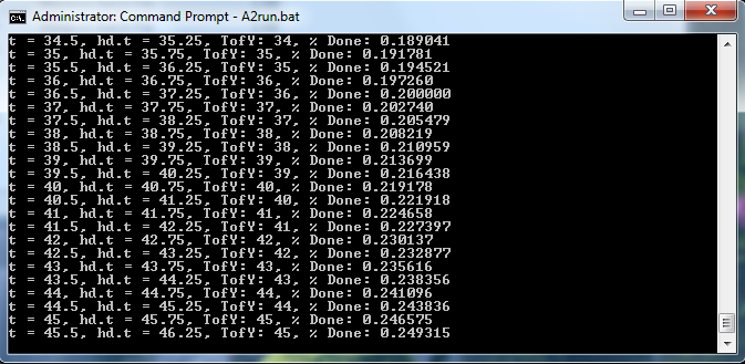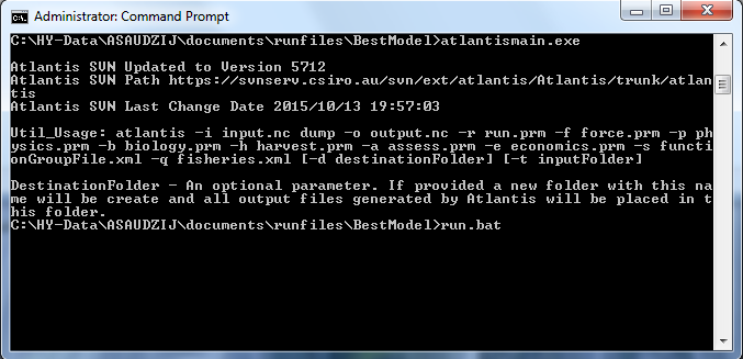 The next step is to create a BAT file such as run.bat (or any name you want, e.g. NoFishing.bat) and then call it from the command prompt to initialise the simulations. The BAT file must be in the same directory as the Atlantis executable.