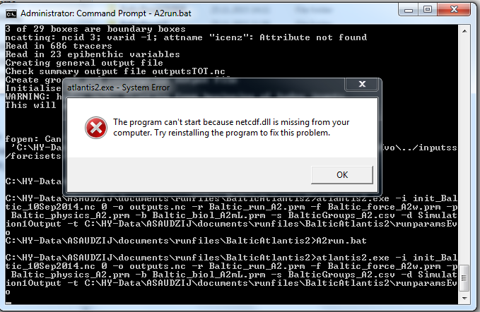 1. Missing DLL files. This is one of the most common problems for Windows users. Make sure you have installed the right version of the NetCDF library and updated the path as described on the wiki. If issues still persist, you might need to remove and reinstall the NetCDF library.