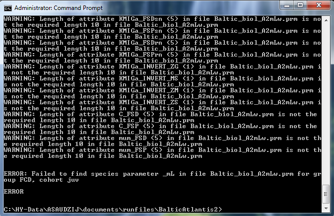 3. Failed to find a parameter. If some of the required parameters in the PRM files are missing Atlantis will quit and give an error message. In the case below Atlantis could not find a parameter FCD_mL. This happens when mistakes were made in formatting parameter files (e.g. if you used excel to create your file check to see if the PRM file contains ” ” around a parameter name, if does remove them and just leave the name) or when new obligatory parameters were added during the code update to account for new functionality (and you have updated the code on your computer)