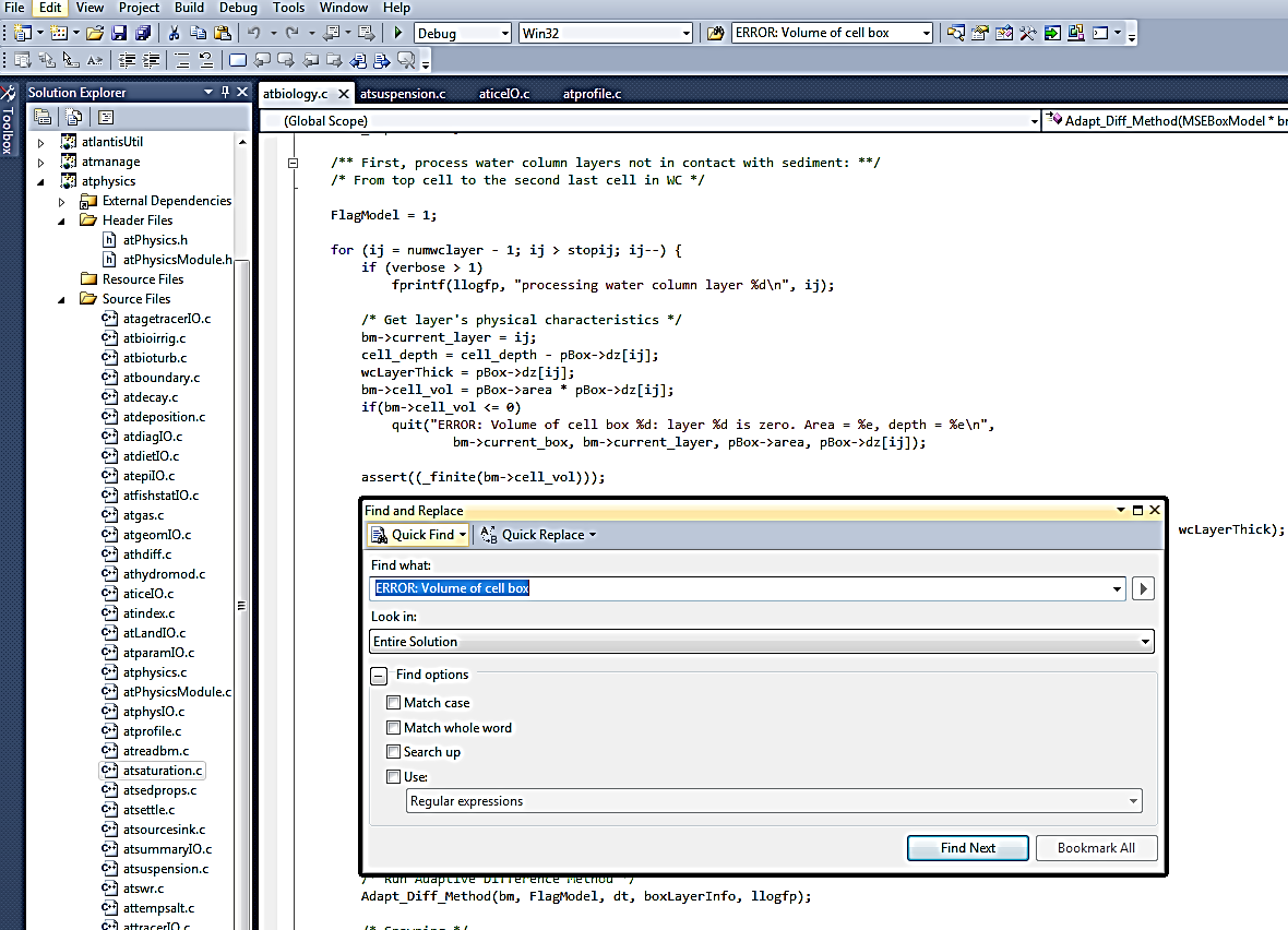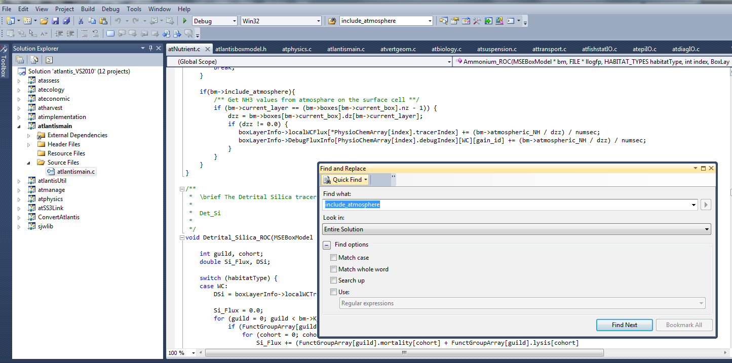 In the example below, we search for the include_atmosphere parameter, used in the physics.prm file. Make sure you search in the “Entire Solution” if you want to browse through the whole code. You can either scroll through the entire list of search results and click directly on the line of interest (if you have some familiarity with the code) or you can click “Find Next” (if you go this route you may need to click a few times to finally get to one of the routines that uses the parameter). For example for include_atmosphere the relevant routine is called Amonium_ROC(), which is indicated on the top right drop-down menu in Visual Studio, and it is located in the file atNutrient.c