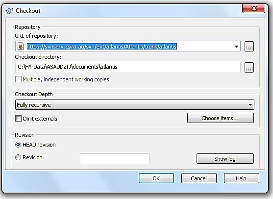 Enter the URL of the code depository, provided on the Atlantis Wiki source code page, making sure the directory to install the code on your computer is correct, and chose “Fully recursive” Checkout Depth and “HEAD revision”. Detailed instructions on how to check out the code with TortoiseSVN are available on the wiki (here).