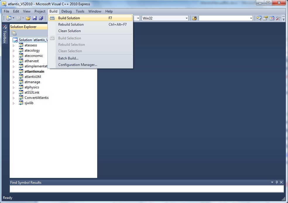 5. Compile the code. In Windows compiling the code does not require any programming skills. All you need to do is double-click the Visual Studio SLN file (chose the version suitable for your Visual Studio, e.g. Atlantis_VS2010.sln) located in the main directory of where you checked out the code (e.g. C:\programs\Atlantis). This will load the project into Visual Studio. Then go to the Visual Studio Build menu and chose “Build Solution”. Detailed instructions are given on Atlantis Wiki building page.