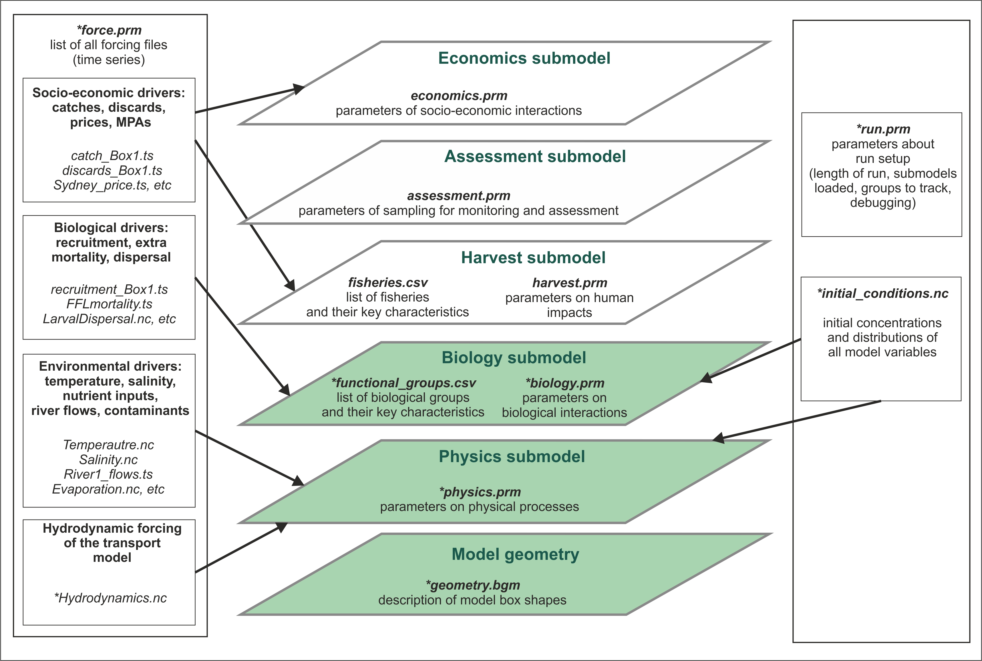 Physics and Biology submodels are required (although you can switch some parts off for debugging purposes), whereas Harvest, Assessment and Economics submodels are optional. Each submodel has a specific PRM file describing parameters used in it. Biology and Harvest submodels also require a list of the relevant groups, such as biological functional groups or list of fisheries, in the CSV format.
