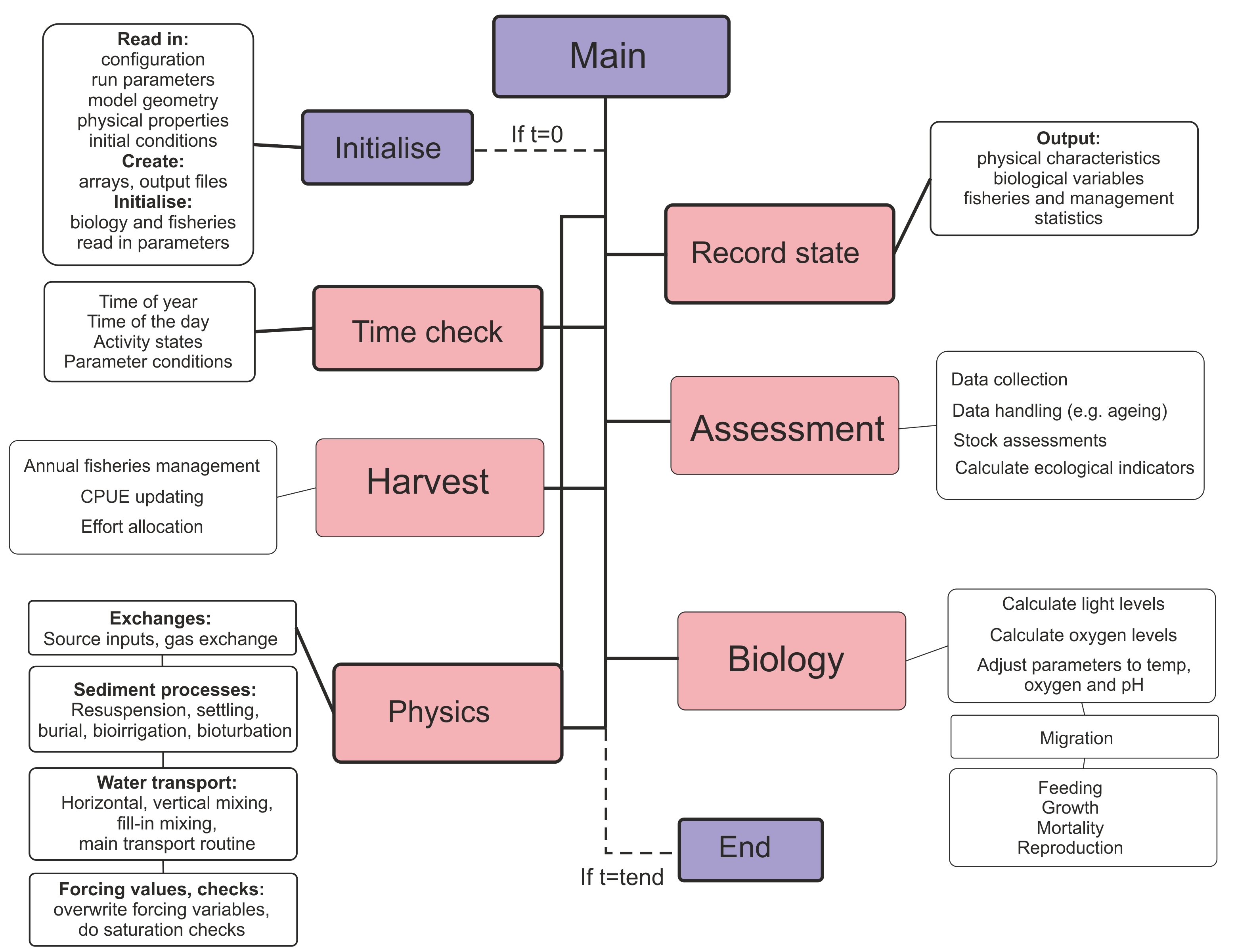 Figure 3. Brief overview of the Atlantis main() routine that calls other routines implemented in various submodels.