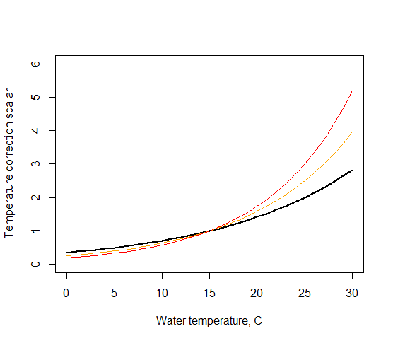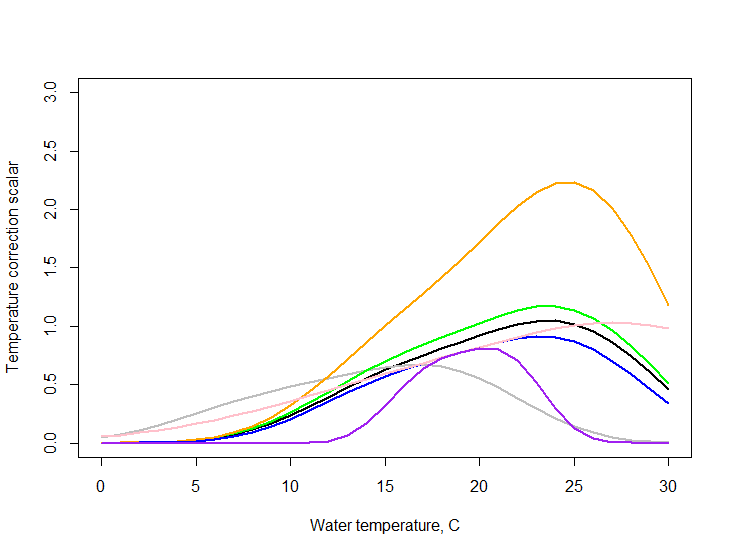 When flagq10effXXX = 1 the efficiency is poorer in cooler water and the Tcorr scalar (Fig. 20) is applied only if water temperature is lower than the optimum or reference level (depending on the q10_method_XXX used).
