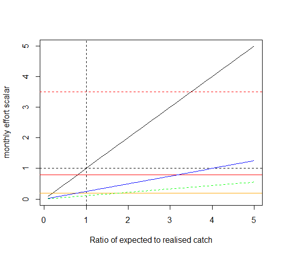 Constrain the minimum effort by the (1-choicebuffer value), where YYY_choicebuffer is the subfleet specific parameter. This parameter defines how quickly a subfleet will downscale the effort if realised catch is higher than expected. In the graph below the red horizontal line corresponds to choicebuffer=0.2 and orange horizontal line corresponds to choicebuffer=0.8.